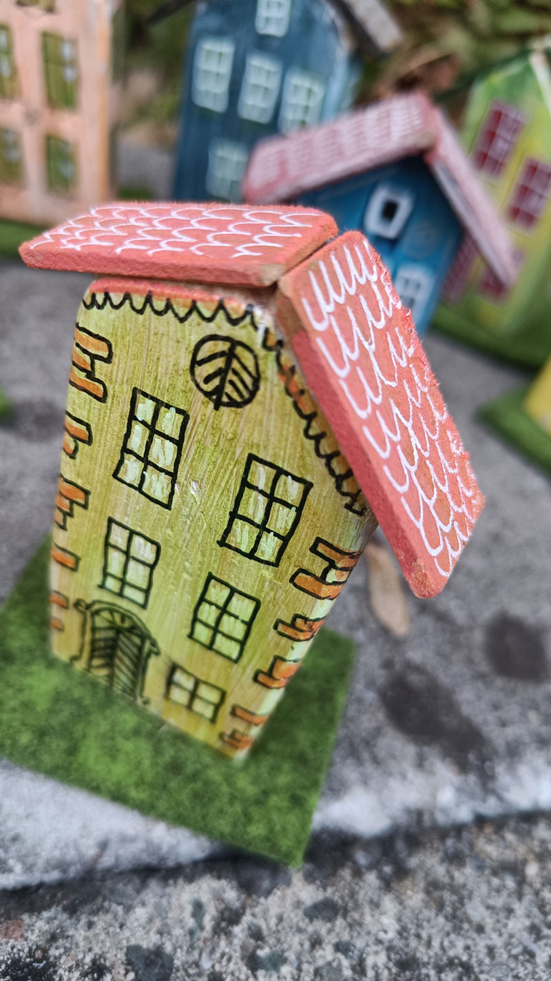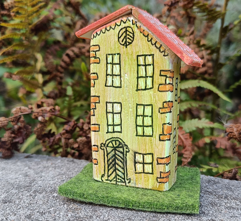 - Ściany domku pomalowane są w słoneczny odcień żółci, symbolizujący radość, ciepło i domowe szczęście.